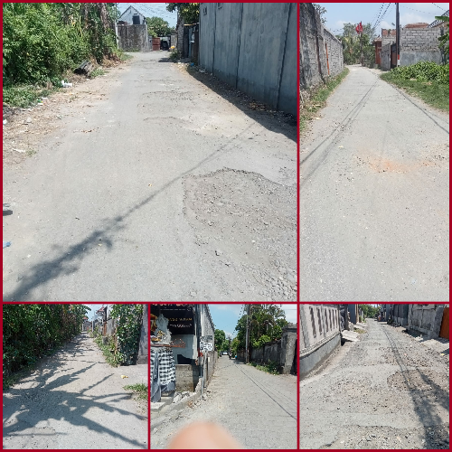 Jl. Sekar Sari IX No.68, Kesiman Kertalangu, Kec. Denpasar Tim., Kota Denpasar, Bali 80237 rusak, ada bagian yang blm di aspal atau di conblock. Sudah pernah lapor di bulan Agustus 2023 sampai mau menuju tahun 2024 belum ada realisasi.