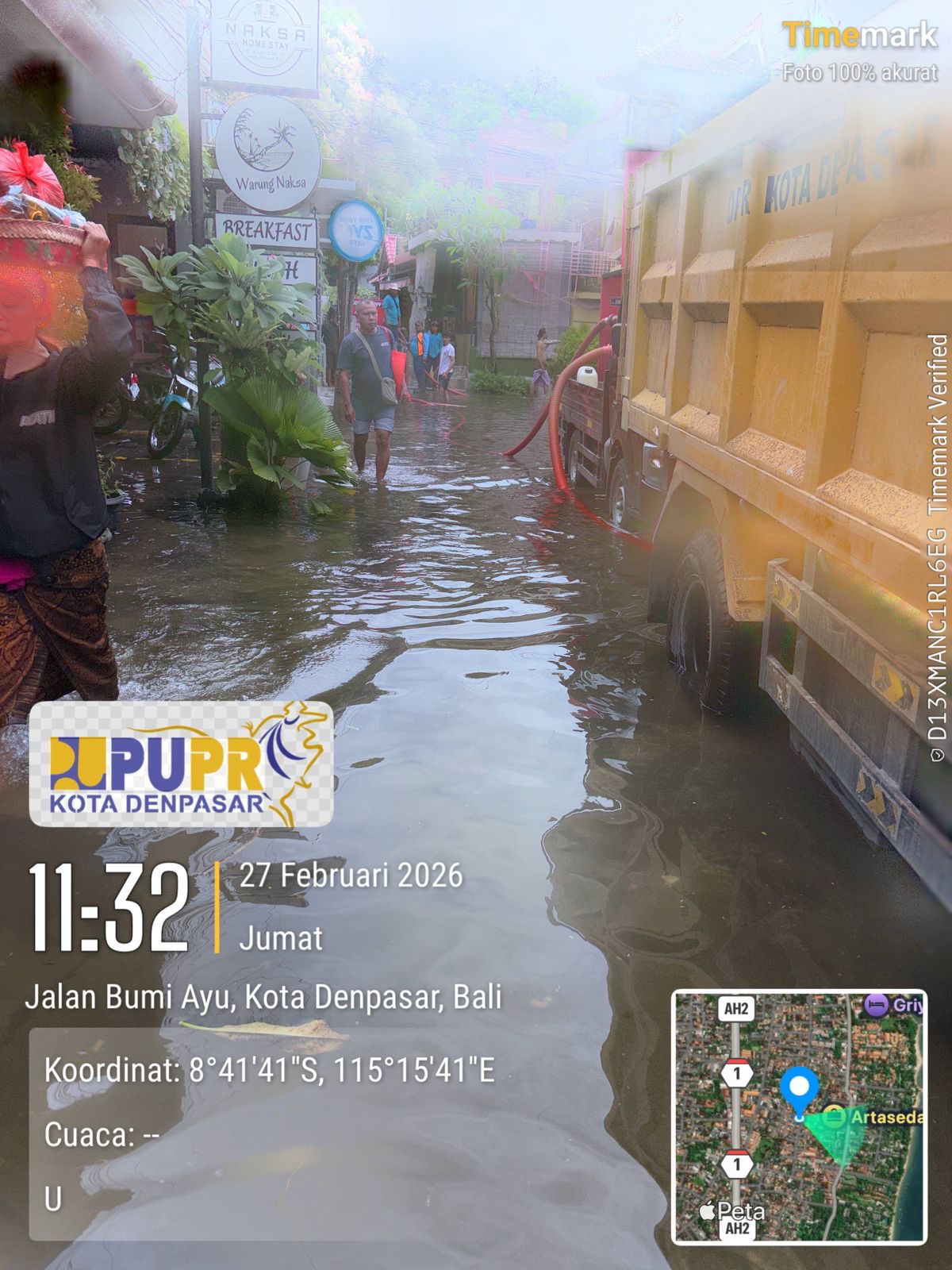 Di Jl. BUMI AYU, SANUR, "Banjir Parah" lagi dan sudah 3 hari air banjirnya belum surut. Terutama di Jl. Bumi Ayu III, dalam kondisi buruk dengan sampah hanyut. Air banjirmya berwarna coklat dan baunya menyengat gara-gara sampah tersebut.
